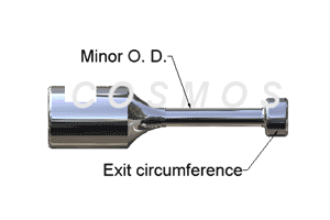 The next touchstone pertains to the minor O. D. of the nozzle (see image,above). It should be small enough to clear the bobbin(s) yet large enough to assure sufficient stiffness to withstand bending. The Second Rule of Thumb, therefore, is to choose a minor O. D. size at least two times that of the bore size. If this criterion cannot be met, the surface finish of the bore becomes critical. Do insist on a mirror finished bore.